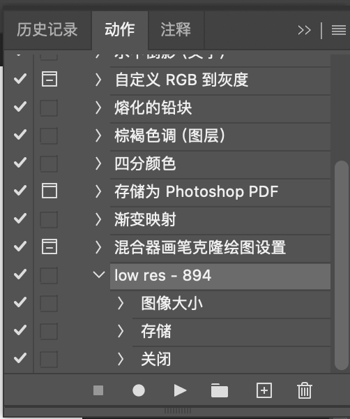 下面是我设置的动作,分为3个动作:调整图像大小 、存储、关闭