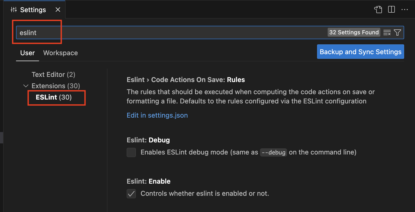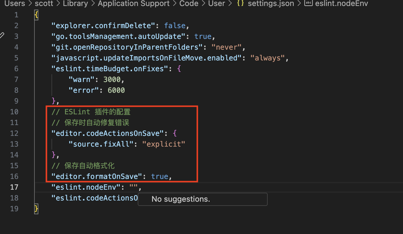 3, 点击user/extensions下的eslint,然后点击 edit settings.json, 添加如下配置: