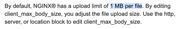 # client_max_body_size 用来修改允许客户端上传文件的大小。默认为1m,如果设置为0,表示上传文件大小不受限制。